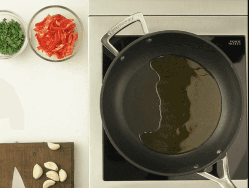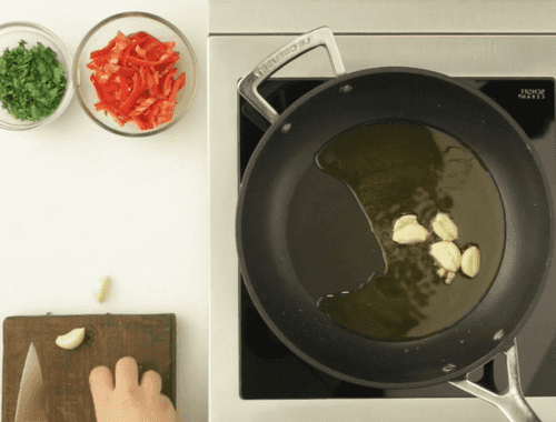 Где-то за 5 минут до готовности спагетти разогреть сковороду, влить в нее оливковое масло.