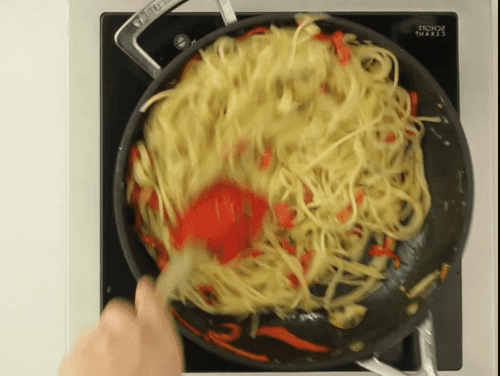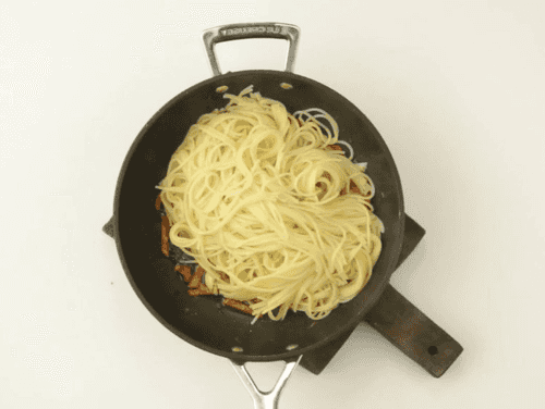 Добавить спагетти в сковороду с обжаренным чесноком, перцем и петрушкой.