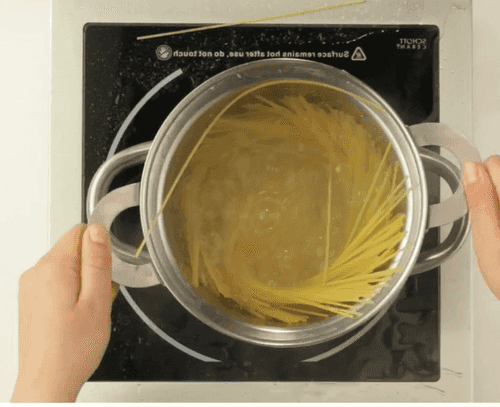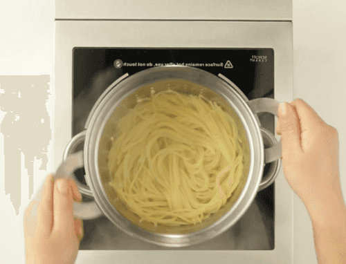 После того как спагетти сварятся до состояния аль денте, слить воду.