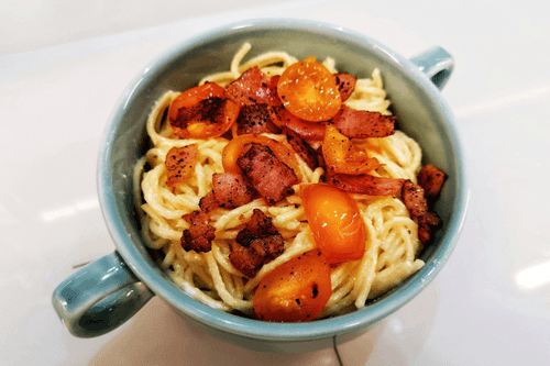 Яичная лапша с беконом — это сочетание насыщенного вкуса копченого мяса и нежности яичной лапши. Блюдо берет вдохновение из западных гастрономических традиций, но с авторским подходом, превращая привычные ингредиенты в изысканный ужин. Хрустящий бекон, пропитанный ароматом черного перца и пикантностью чили, гармонично сочетается с мягкой лапшой, которая впитывает в себя сливочную текстуру майонеза. Томаты черри добавляют освежающую кислинку и яркий цвет, превращая простую трапезу в кулинарное наслаждение. Блюдо идеально подойдет как для уютного семейного ужина, так и для быстрой, но эффектной трапезы, которая порадует даже требовательного гурмана.