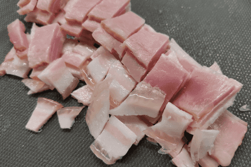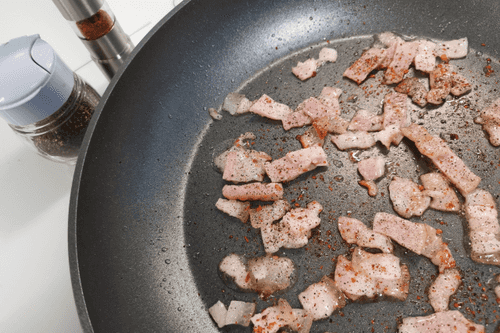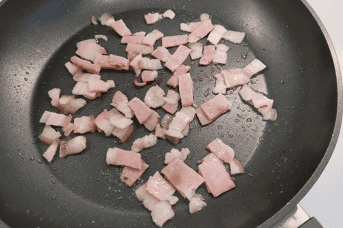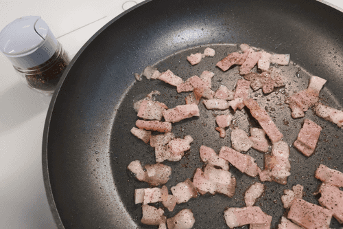 В сухую разогретую сковороду выложить бекон. Обжаривать на сильном огне 3–4 минуты, периодически помешивая.