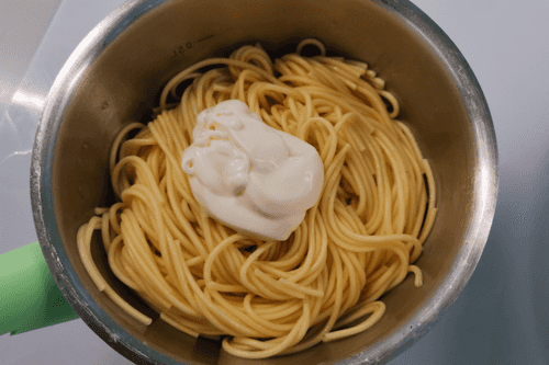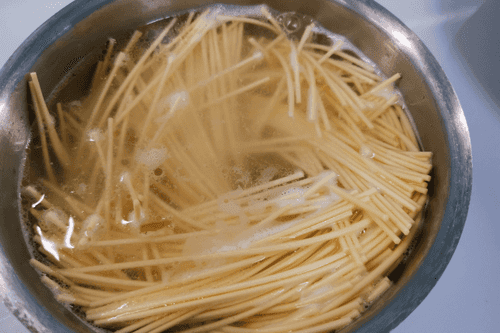 Вскипятить воду для лапши. Посолить и добавить масло.
