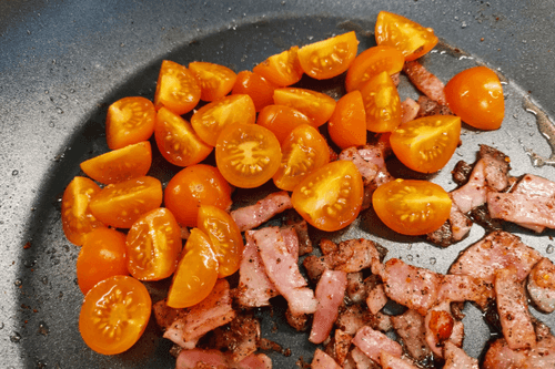 Добавить черри к бекону и убавить огонь. Пассировать около 5 минут.