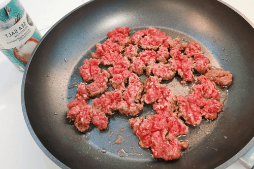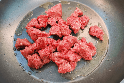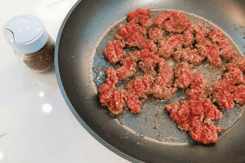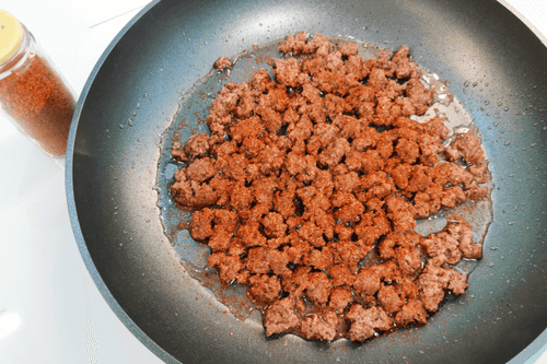 Выложить фарш и обжаривать его 2–3 минуты на сильном огне.