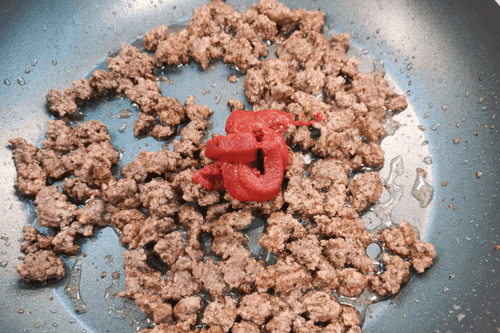 Добавить томатную пасту, убавить огонь и перемешать. Обжаривать еще около 5–7 минут, периодически помешивая.