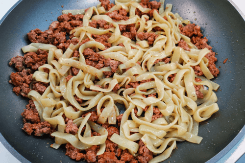 Добавить ширатаки к фаршу. Обжаривать, помешивая, еще 3–4 минуты.