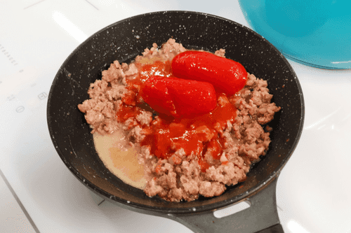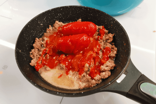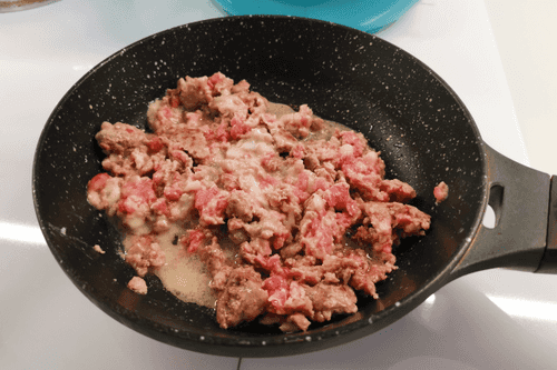Выложить фарш и обжаривать на сильном огне 2–3 минуты.
