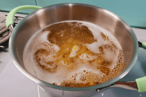В кастрюле смешать воду и бульон. Поставить на сильный огонь.
