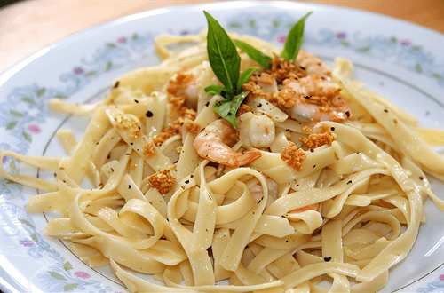 Паста лингвини с креветками и свежей зеленью