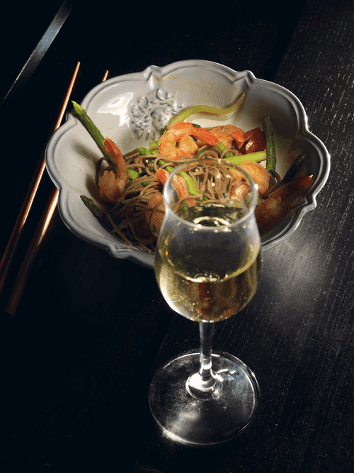 Гречневая лапша с креветками и зеленой спаржей
