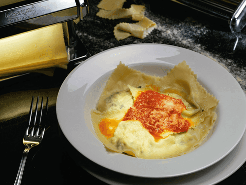 Тесто раскатать в паста-машине, на один лист выложить начинку по одной чайной ложке через каждые 5 см, накрыть вторым листом теста, пальцами прижать верхний лист к нижнему и вырезать ножом квадраты 5х5 см.
