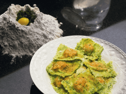 Зелёные равиоли с тыквой и соусом из шалфея – это изысканное блюдо итальянской кухни, в котором нежное тесто, окрашенное хлорофиллом из шпината, сочетается с богатой, сладковатой начинкой из запечённой тыквы, амаретти и пикантной мостарды. Шалфейный соус на основе сливочного масла придаёт блюду утончённый аромат и бархатистую текстуру. Это блюдо – настоящее произведение искусства, объединяющее традиционные итальянские вкусы с кулинарным мастерством. Равиоли не только радуют глаз своим ярким зелёным оттенком, но и восхищают балансом сладкого, солёного и орехового вкусов. В Италии его подают как праздничное блюдо, а его нежная структура и глубина вкуса делают его идеальным для уютных семейных ужинов и торжественных ужинов.