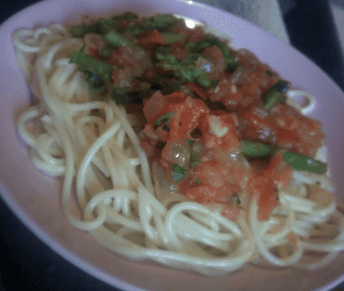 Спагетти с зеленой спаржей, помидорами и кинзой