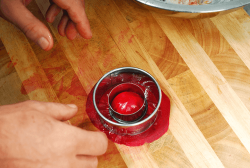 В центр листа свеклы выложить горкой 8–10 грамм начинки. Накрыть вторым свекольным диском. Теперь понадобятся два кулинарных кольца: поменьше и побольше диаметром. То, что меньше, надеть на горку начинки — нережущим краем вниз, просто чтобы придать ей форму. Второе кольцо, побольше, острой кромкой должно обрезать неровные края равиоли.