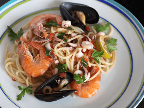 Спагетти с морепродуктами – изысканное блюдо итальянской кухни, вобравшее в себя свежесть моря и насыщенные ароматы средиземноморских ингредиентов. Оно появилось в приморских регионах Италии, где рыбаки готовили простые, но невероятно вкусные блюда из улова дня. Нежные кальмары, сочные мидии и креветки, пропитанные вином и ароматом чеснока, создают богатый, гармоничный вкус. Лайм придает легкую цитрусовую свежесть, а петрушка завершает композицию тонкими зелеными нотами. Подается горячим, прямо из кастрюли, позволяя ингредиентам сохранять насыщенность вкуса. Это идеальный выбор для романтического ужина или семейного застолья, где морская элегантность сочетается с уютом домашней кухни.