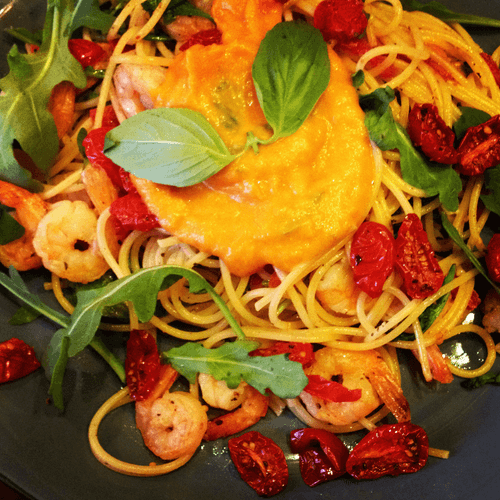 Паста с креветками и рукколой