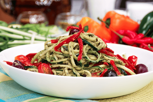 Спагетти из цукини с соусом песто — это современная интерпретация традиционных итальянских вкусов, вдохновлённая средиземноморской кухней. Это лёгкое, освежающее блюдо, где нежные полоски цукини заменяют классические макаронные изделия, создавая низкокалорийный и полезный вариант пасты. Пикантный песто с базиликом, орехами и чесноком наполняет блюдо насыщенным ароматом, а добавление помидоров и сладкого перца привносит яркие нотки свежести. Блюдо идеально подходит для тёплого летнего дня или лёгкого ужина. Спагетти из цукини хорошо пропитываются соусом после кратковременного охлаждения, что делает вкус более насыщенным. Это отличное решение для тех, кто хочет насладиться итальянской кухней без лишней тяжести, сохраняя при этом традиционные вкусовые сочетания. Простое в приготовлении, оно станет украшением любого стола!