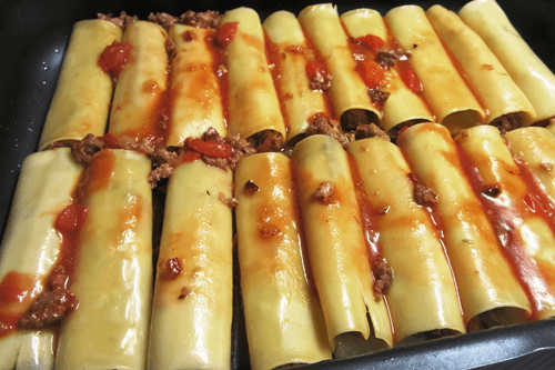 Достаем форму для духового шкафа, смазываем оливковым маслом. Духовку разогреваем до 180 градусов. Наполняем каннеллони соусом, щедро засыпаем сыром.