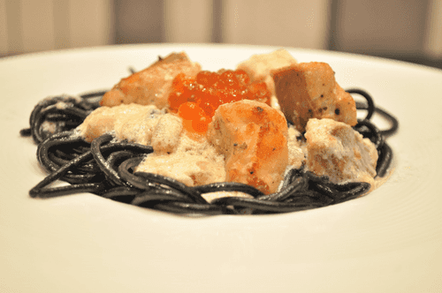 Черная паста в сливочном соусе с лососем и красной икрой — это изысканное блюдо итальянской кухни, воплощающее гармонию вкусов и текстур. Черные макароны, благодаря добавлению чернил каракатицы, приобретают не только необычный цвет, но и тонкие морские нотки. Нежный лосось, слегка обжаренный на оливковом масле, добавляет глубину и насыщенность вкусу. Сливочный соус, обогащенный белым вином и пармезаном, приобретает бархатистую текстуру и легкую кислинку. Красная икра, завершающий штрих, придает блюду пикантность и элегантность. Это блюдо идеально подойдет как для романтического ужина, так и для торжественного застолья, поражая своим утонченным вкусом и стильной подачей.