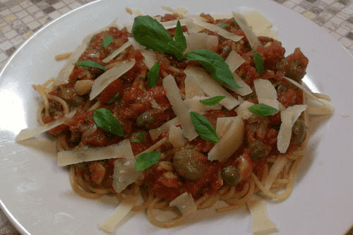 Спагетти а-ля путанеска с томатами и анчоусами