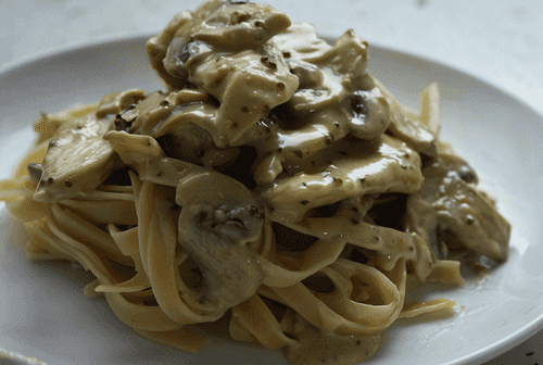 Индейку с грибами посолить и поперчить по вкусу. Подавать блюдо, выложив на тарелки макароны, а сверху индейку с шампиньонами, полить все соусом.
