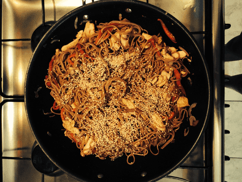 Натрите соломкой морковь и болгарский перец, лук нарежьте полукольцами и обжарьте до момента когда морковь и перец станут мягкими. Добавите куриное филе и гречневую лапшу. Обжарьте 5 минут, добавьте кунжут и соевый соус по вкусу, готовьте еще 5 минут под крышкой.