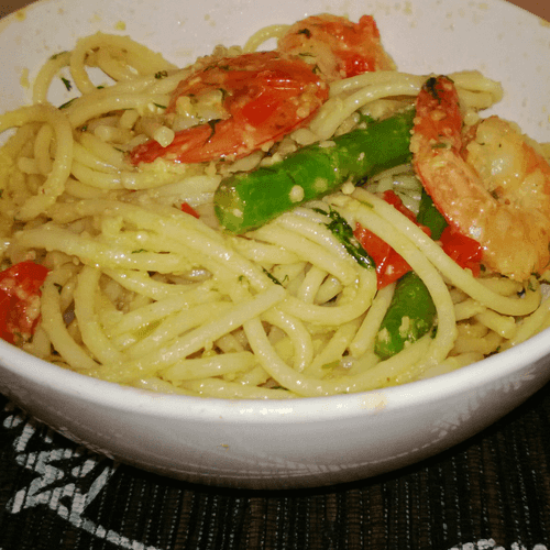 Спагетти с креветками и спаржей
