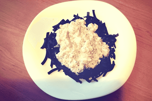 Спагетти с чернилами каракатицы и лососем