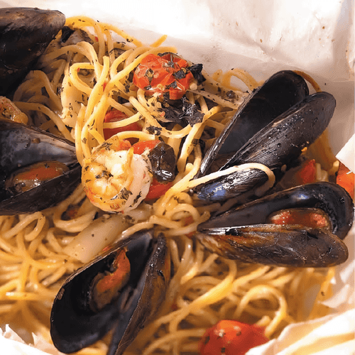 Запеченные спагетти с морепродуктами – это истинное воплощение итальянской гастрономии, где свежесть даров моря соединяется с ароматными травами и пряностями. Это блюдо родилось в прибрежных регионах Италии, где рыбаки использовали самые свежие морепродукты, дополняя их легкими ингредиентами, позволяющими раскрыть их естественный вкус. Креветки, мидии и кальмары, обжаренные с чесноком и пеперончино, приобретают богатый, пикантный аромат, а запекание в пергаменте придает пасте нежную текстуру и насыщенный вкус. Томаты черри добавляют сладкую кислинку, а базилик – свежесть. Такое блюдо идеально подходит для романтического ужина или уютного семейного застолья, даря ощущение солнечного итальянского побережья и наслаждение истинной средиземноморской кухней.
