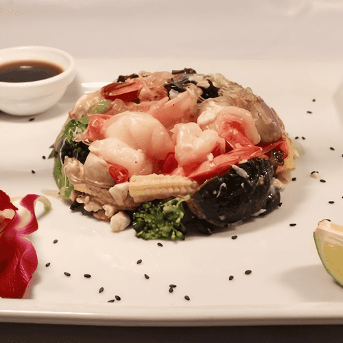 Стеклянная вермишель с креветками — это изысканное блюдо, которое сочетает в себе тонкие восточные нотки и итальянскую элегантность. Рисовая лапша, пропитанная ароматом устричного и рыбного соуса, приобретает насыщенный вкус, дополняемый свежестью лайма. Овощи, такие как брокколи, паприка и мини-кукуруза, придают блюду хрустящую текстуру, а жареное яйцо вносит в него нежность. Завершающий штрих — молотый кешью, который добавляет ореховый оттенок, превращая каждую вилку в гармонию вкусов. Это блюдо идеально подходит для тех, кто ищет баланс между легкостью и насыщенностью, а его быстрая готовка делает его отличным вариантом как для семейного ужина, так и для вечеринки с друзьями.