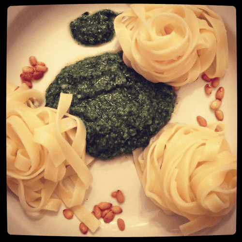 Готовый соус выложить в центр тарелки, рядом разложить гнезда тальятелли, украсить поджаренными орешками, поперчить и подать к столу.