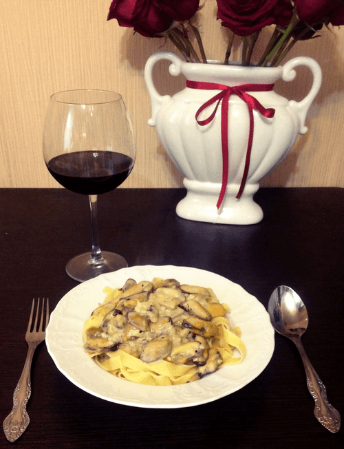 Через 7–8 минут влить сливки и тушить мидии дальше, до загустения сливок. Если сливки долго не густеют, можно добавить немножко муки.