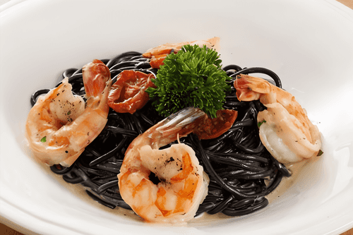 Полученный соус перемешать с отваренными черными спагетти (100 г) и выложить на тарелку.