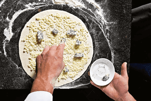 Выложить на тесто натертую моцареллу и нарезанную небольшими кусочками горгонзолу. Главное тут — не покупать свежую моцареллу: натереть ее не получится, так что нужно выбирать твердую, пригодную именно для пиццы.