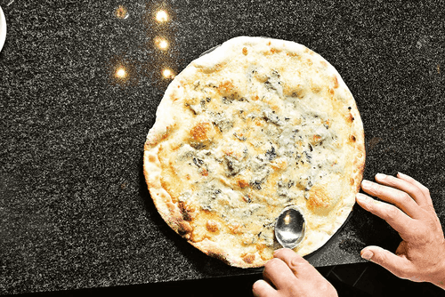 Как только пицца покажется готовой, ее можно вынимать. Растаявшие кусочки горгонзолы растереть ложкой по всей поверхности пиццы, чтобы она покрылась тонким слоем сыра. Корочку по краю можно оставить и без сыра — на ваше усмотрение.