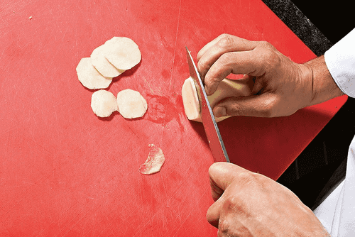 Нарезать грушу тонкими кружками, используя острый нож, а лучше мандолину или слайсер. Сердцевина в грушах «конференц» не настолько грубая, чтобы ее вырезать. А вот от косточек, если они попадутся при нарезке, лучше избавиться.