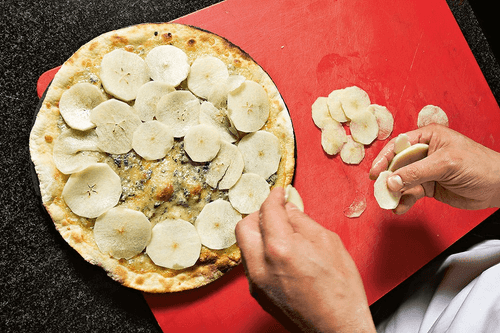 Получившимися кружочками покрыть всю поверхность пиццы. Принципам строгой геометрии следовать не обязательно, можно дать волю фантазии и выложить грушей хоть круги, хоть зигзаги, хоть квадраты.