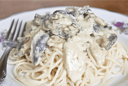 Приготовьте сливочный соус. Крупно нарезанные шампиньоны обжарьте с луком (мелко нарезанным) в растительном или оливковом масле так, чтобы образовалась легкая золотистая корочка. Затем добавьте куриные волокна к ним и соедините со сметаной или сливками, которые должны быть теплыми, чтобы не свернуться в блюде. Поперчите и посолите по вкусу, а затем оставьте тушиться на среднем огне, пока соус не достигнет нужной консистенции.