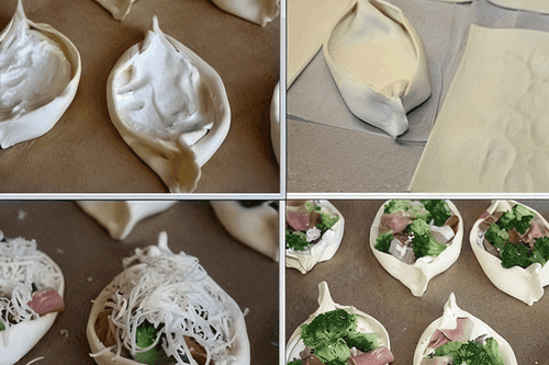 Тесто разрезать на 8 частей. Каждую часть в серединке немного прижать/расплющить пальцами. Края защипнуть, получатся небольшие лодочки. Выложить их на противень с пекарской бумагой. Каждую лодочку внутри смазать сметаной. Поверх выложить брокколи с беконом (и луком). Посыпать тертым сыром. Брокколи я не солила, так как и сыр и бекон уже достаточно соленые.