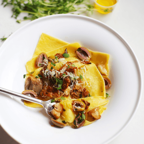 Открытая лазанья с белыми грибами и оливками