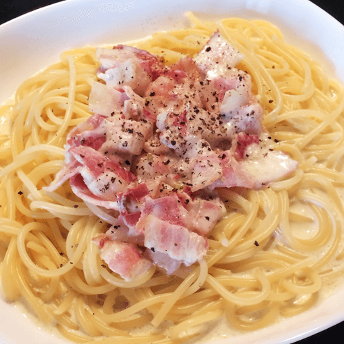 Спагетти в сливочном соусе с песто и беконом