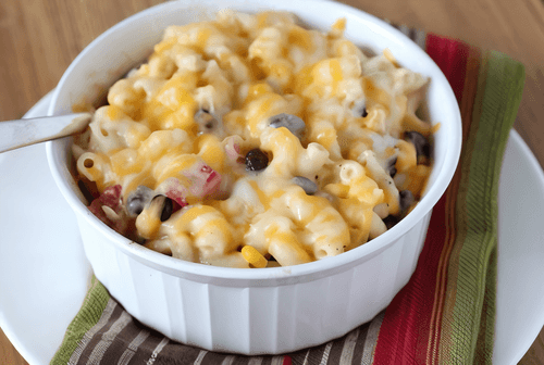 Сварить макароны в подсоленой воде. Помидоры нарезать, перемешать со сметаной, бобами и кукурузой. Смешать сметанную смесь с макаронами и 3/4 частью сыра.