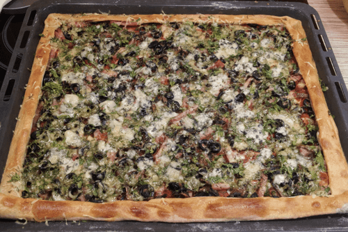 Поставить противень с пиццей в предварительно разогретую до 200 градусов духовку на 15 минут.