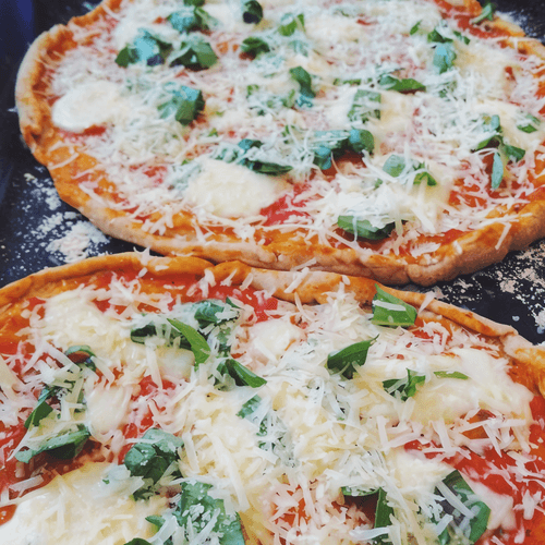 Базилик разбираем на листики. Моцареллу нарезаем кружочками. Чем тоньше ломтики моцареллы, тем вкуснее. Вынимаем пиццу, раскладываем моцареллу и возвращаем в духовку на 2 минуты. Посыпаем листиками базилика, тертым пармезаном и перцем.