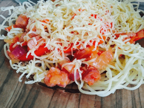 Подавать спагетти, полив сверху овощами с ветчиной и посыпав натертым сыром.