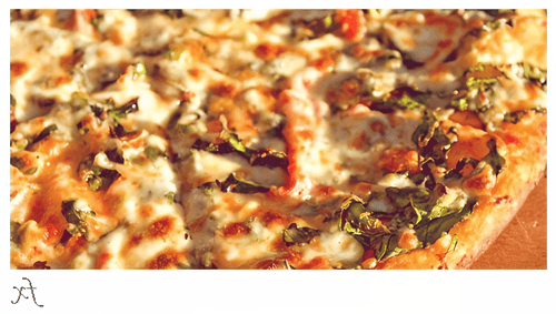 По истечении 10 минут вынуть доску (противень) и посыпать всю поверхность сначала зеленью и шпинатом, а затем сыром. Поставить обратно в печь, запекать до полного расплавления сыра (примерно 5-10 минут). Пицца готова!