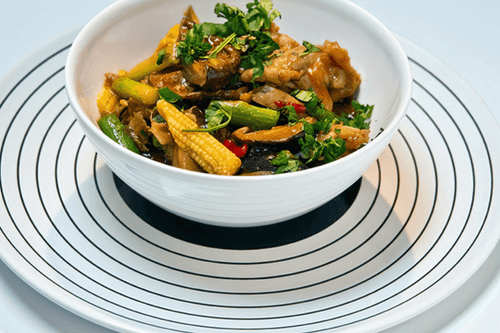 Разогреть глубокую сковороду с добавлением растительного масла. Помешать чеснок, имбирь и перец чили. Добавить спаржу, кукурузу и грибы шиитаке. Добавить сахар и белый перец. Перемешать. Растворить крахмал в воде. Поместить свинину в сковороду, когда овощи слегка обжарятся. Добавить соевый соус, устричный соус, крахмал и кунжутное масло. Обжаривать до готовности.