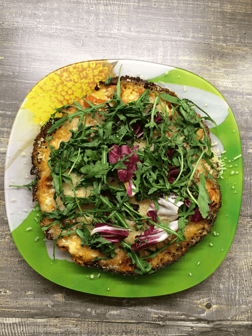 Готовые пиццы посыпать рукколой и пармезаном.
