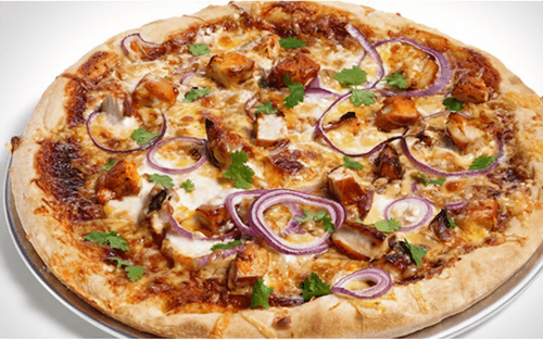 Пицца с соусом барбекю, копченым сыром гауда, куриным филе и красным луком