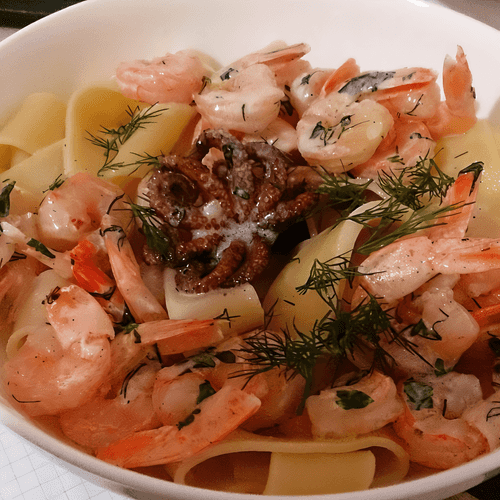 Паста с креветками и осьминожками — это элегантное блюдо, которое соединяет изысканность морепродуктов и нежность сливочного соуса. Этот рецепт напоминает вкусы средиземноморской кухни, где свежесть и простота ингредиентов создают гастрономическое удовольствие. Осьминожки, медленно сваренные до мягкости, приобретают насыщенный, слегка сладковатый вкус, а креветки, тушенные в сливках с укропом, дополняют блюдо нежностью. Паппарделле — широкая паста, идеально удерживающая соус, объединяет все компоненты в гармоничное сочетание. Это блюдо подходит как для романтического ужина, так и для уютного вечера в кругу близких, даря вкус морской свежести и утонченности.